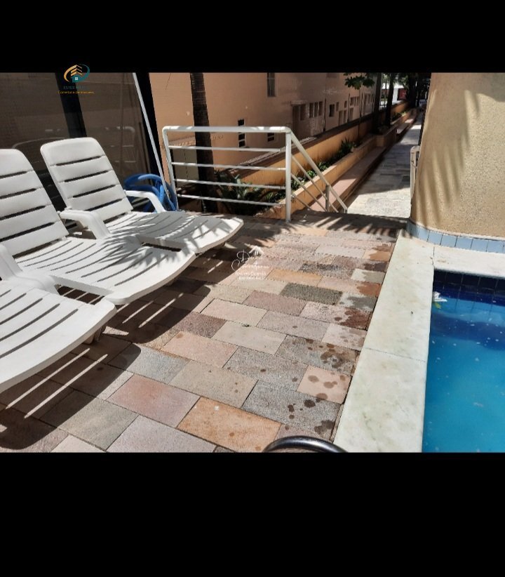 Areá comum com piscina e área de churrasqueira e sacada